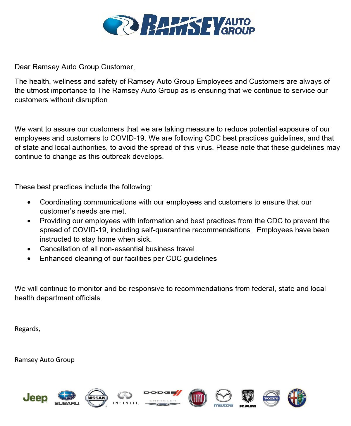 - We enhanced the techniques used to clean our vehicles after each loaner/test drive. In particular, we are paying special attention to interior customer touch points such as seats, steering wheels, door handles and other hard surfaces.